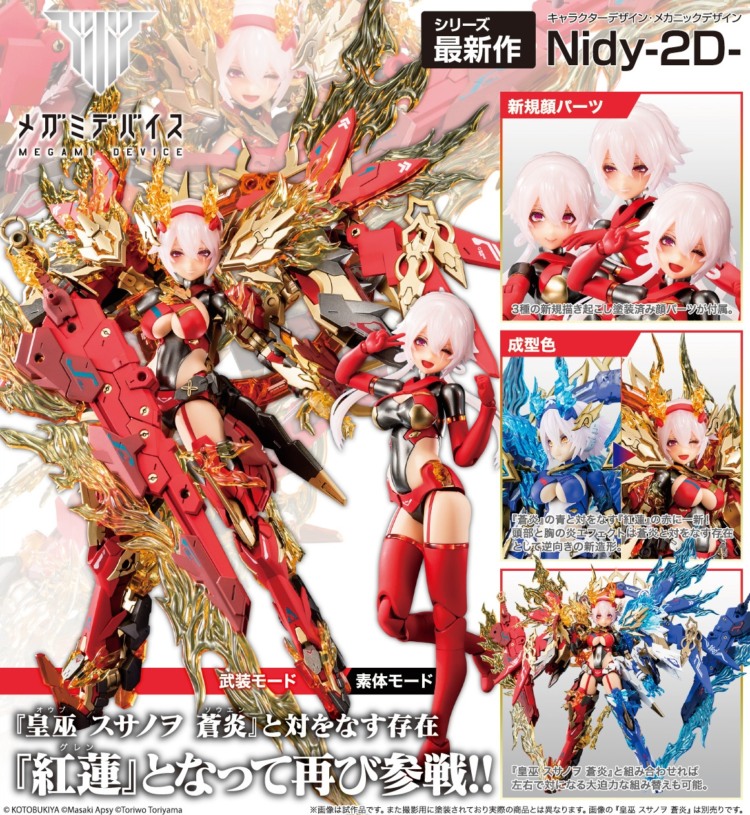 AUB Susanowo Guren gia nhập đội hình figure-kit “Megami Device” từ Kotobukiya! Cô ấy được đúc bằng màu vàng nóng và đỏ như một phiên bản đối trọng của AUV Susanowo Souen để tạo nên hình ảnh rực lửa! Cô ấy được đúc bằng màu da sẫm hơn và dấu mắt của cô ấy cũng đã được thay đổi. Cô ấy được thiết kế bởi Nidy-2D và sử dụng thân “Machinika Block 1.5L” do Maki Asai thiết kế để tạo ra những tư thế năng động và đẹp mắt, bao gồm khả năng ngồi tự nhiên! Cô ấy đi kèm với nhiều bộ phận hiệu ứng trong suốt có hình dạng ngọn lửa và các bộ phận khớp nối để kết nối chúng; ba tấm mặt nạ khác nhau được bao gồm.